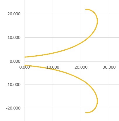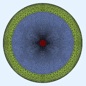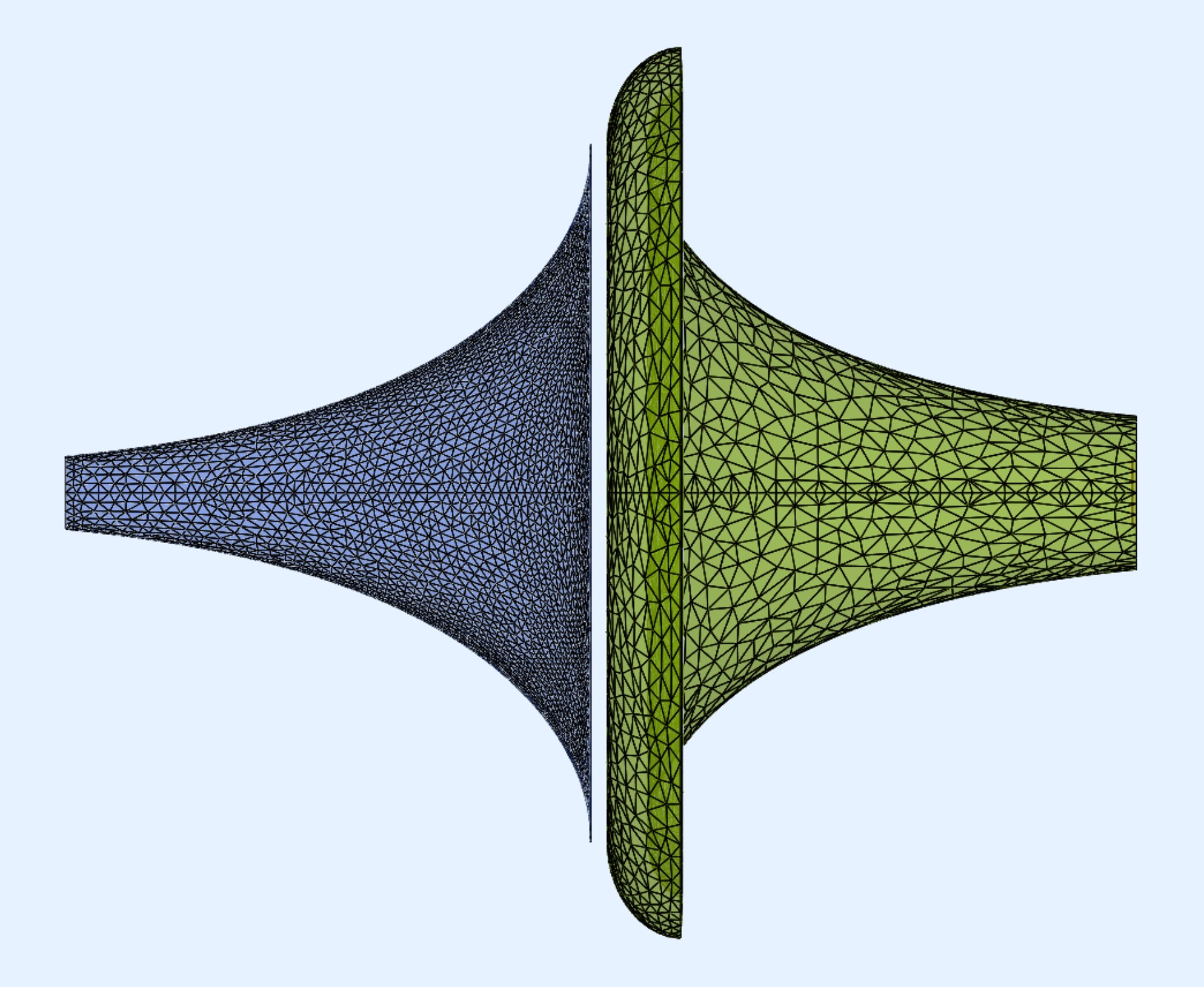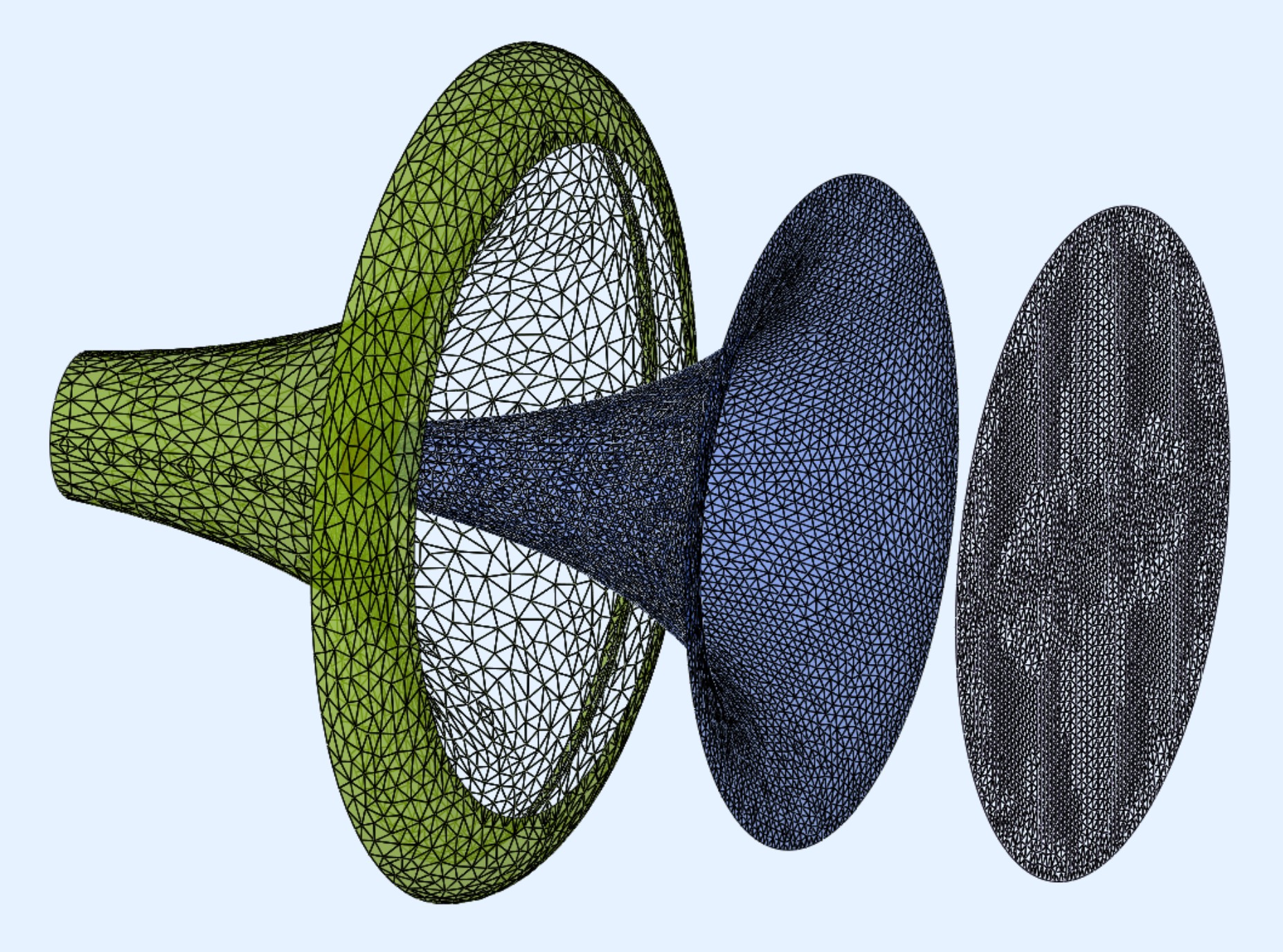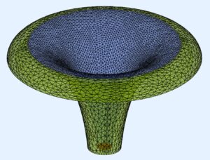 For the BEM simulation with AKABAK, I first created a 3D model after the spline import by thicken the 2D surface by 20mm. This results in a realistic shape if the horn had been created with a 3D printer, for example. The BEM model consists of 3 parts: the horn up to the apex (middle) and the rollback from 90° to 180° plus the thickened outer parts (left). The interface (right) connects the two subdomains: